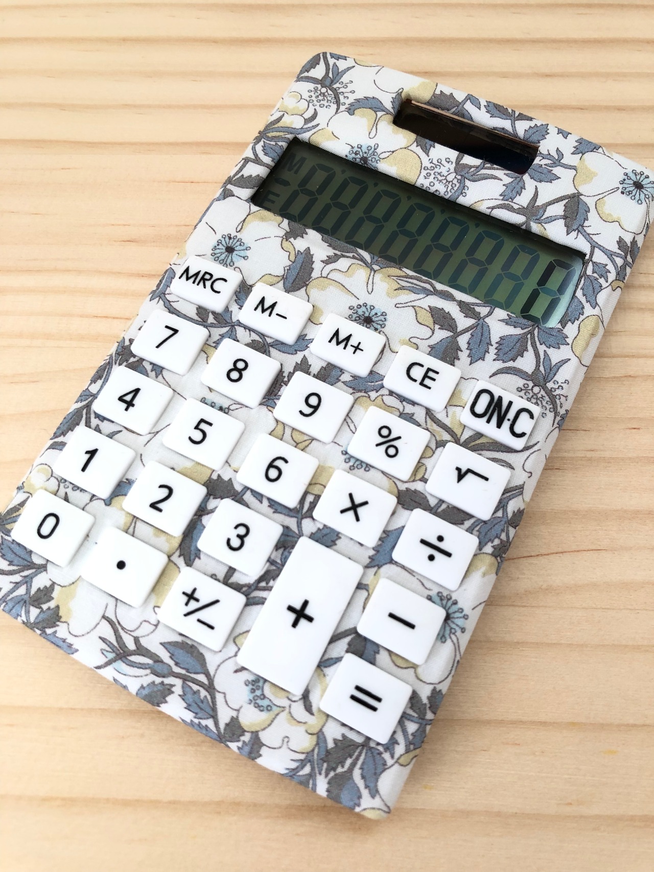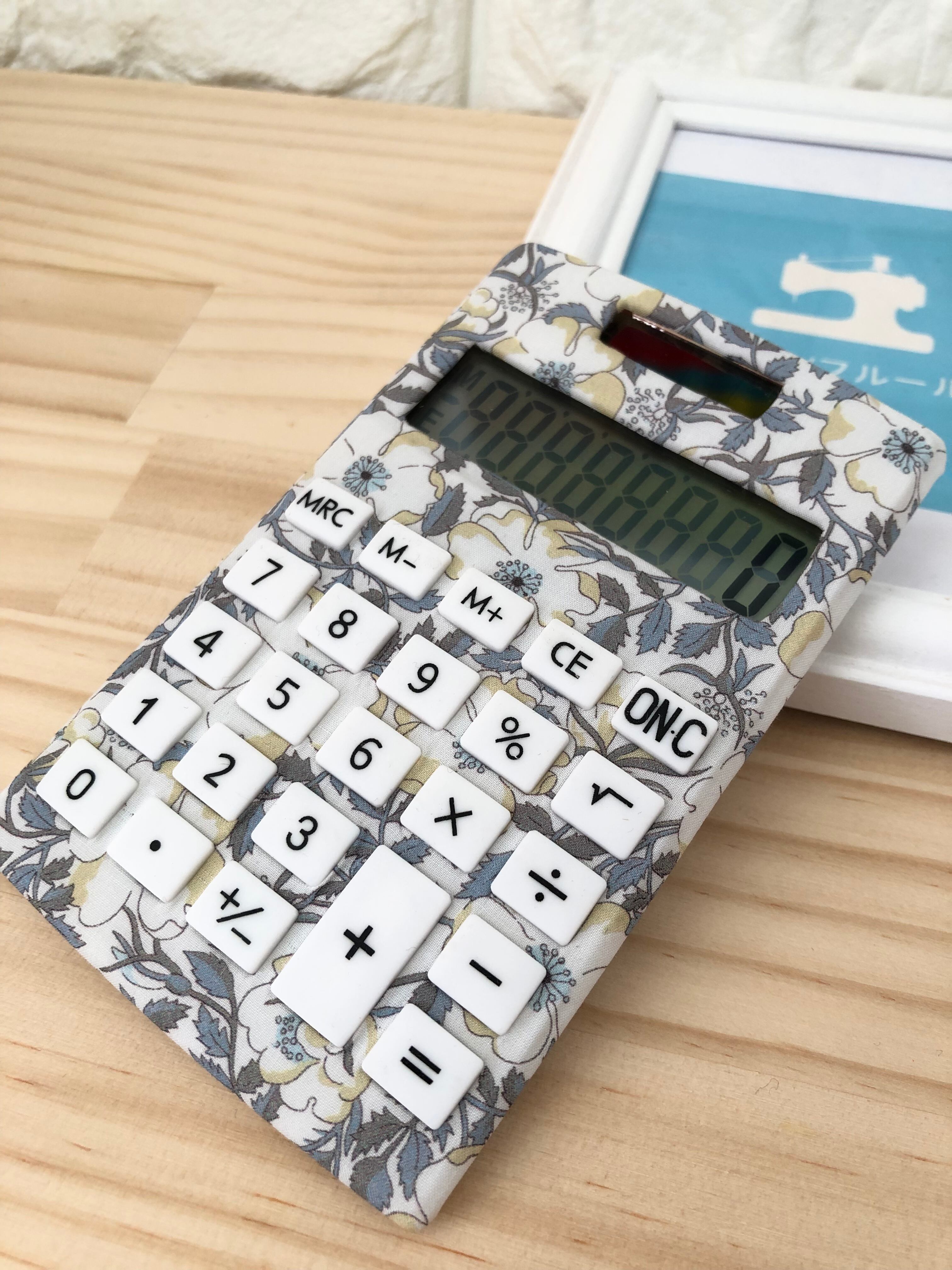 市販のソーラー電卓を大人気のリバティ生地を使用したファブリックデコレーション電卓になります。